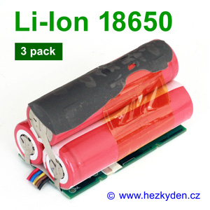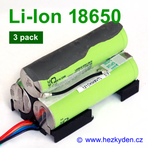 Aku-pack ze tří sériově spojených baterií Li-Ion 18650 Panasonic/Sanyo s ochranným modulem.