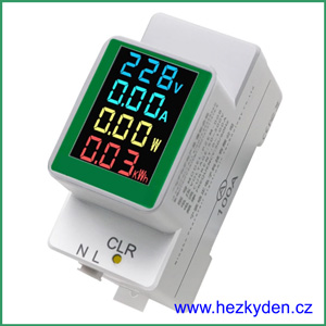 Jednoduchý síťový jednofázový elektroměr na DIN lištu se čtyřmi měřidly: voltmetr, ampérmetr, wattmetr a měřič spotřeby. Ideální jako elektroměr pro FVE.