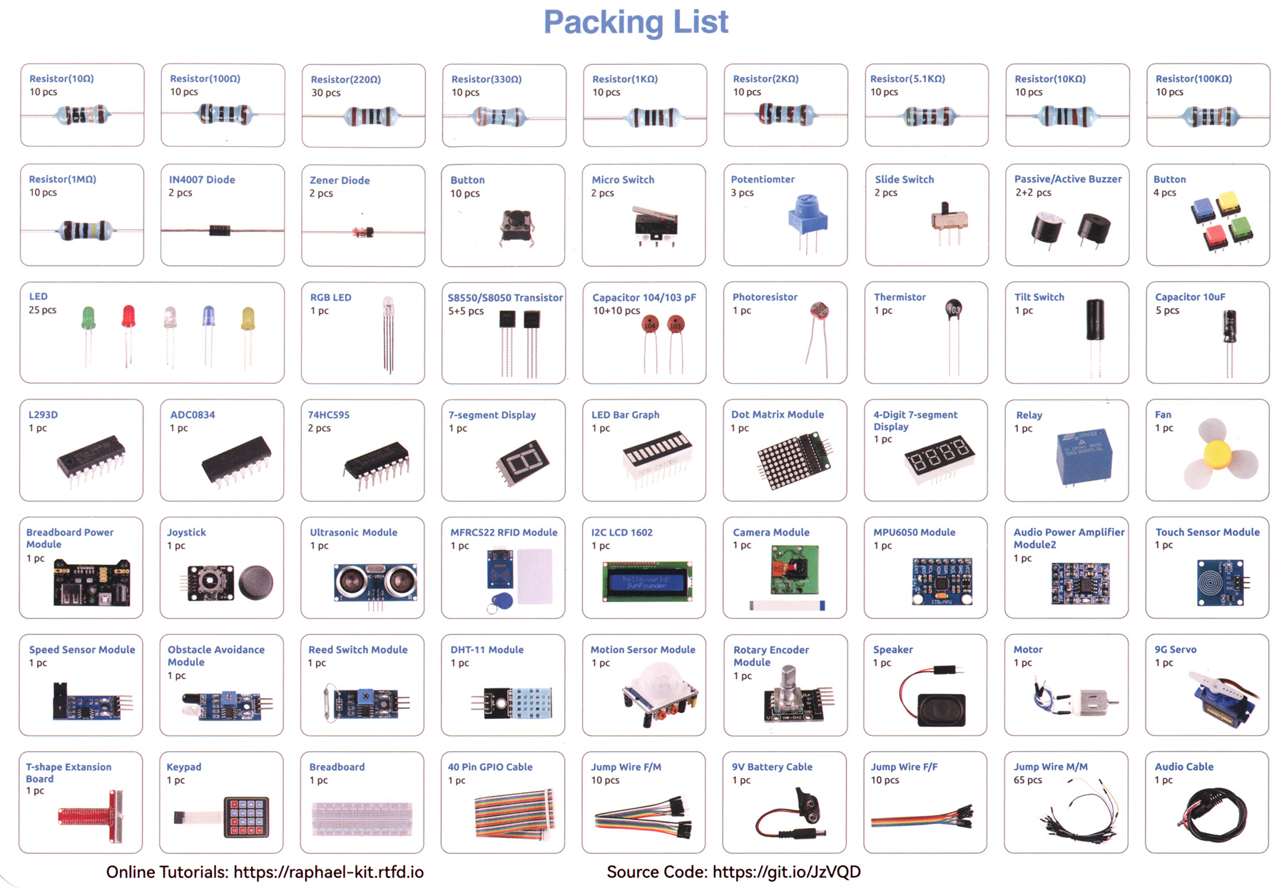 Sada modulů, součástek, kontaktního nepájivého pole a propojovacích kablíků pro Raspberry Pi (Raphael Kit/Da Vinci Kit) za poloviční cenu. Vhodné jako dárek pro studenta nebo jako vybavení do školní laboratoře.