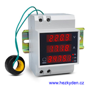 Kombinovaný voltmetr, ampérmetr a wattmetr na DIN lištu pro měření střídavého napětí a proudu (AC). Měří napětí, proud, výkon a účiník.