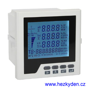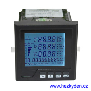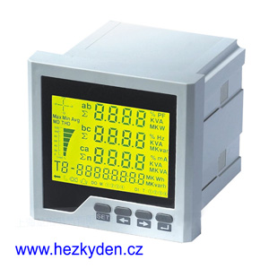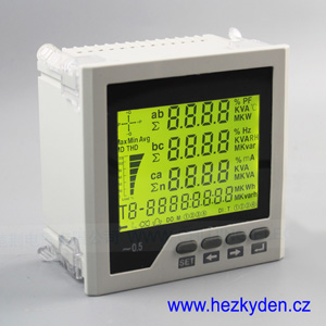 3fázový panelový multifunkční elektroměr (analyzátor) měří: napětí, proud, výkon, účiník, kmitočet. Skoro by se dalo říci, že je to třífázový multimetr.