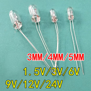 Miniaturní skleněná žárovka na malé napětí válcového tvaru s radiálními vývody.